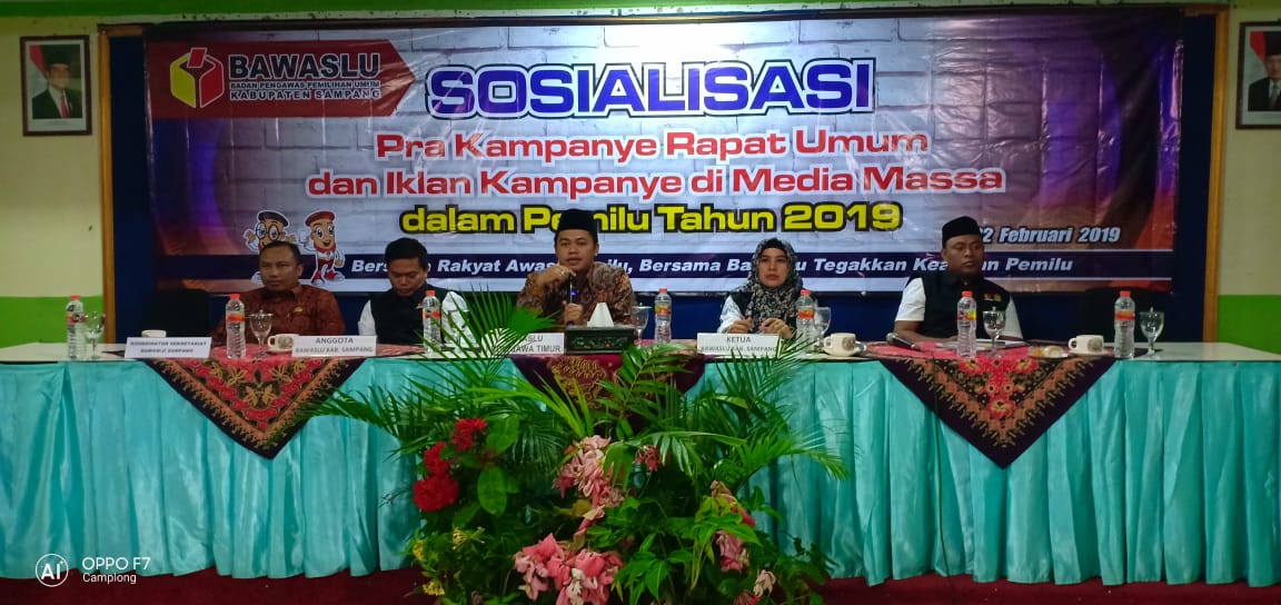 Antisipasi dan Meminimalisir pelanggaran bagi Peserta Pemilu, Badan Pengawas Pemilu (Bawaslu) Sampang menggelar Sosialisasi Pra Kampanye di Media Massa dalam Pemilu 2019, Jum'at 22/02/2019 di Hall Trunojoyo Hotel Camplong.