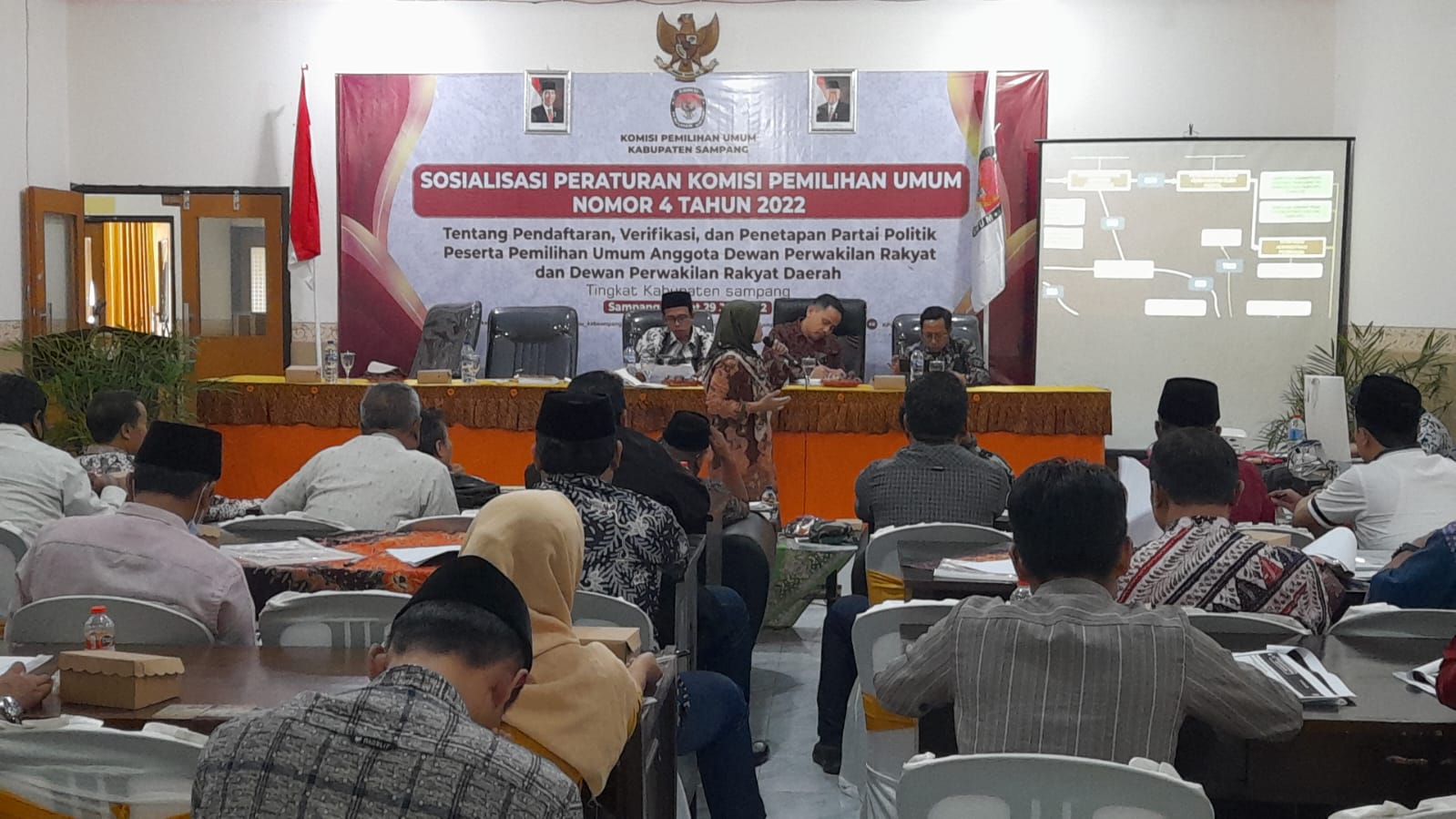 Sampang - Komisi Pemilihan Umum (KPU) Kabupaten Sampang Jum’at 29 Juli 2022 menggelar kegiatan sosialisasi Peraturan KPU Nomor 4 Tahun 2022 tentang Pendaftaran Verifikasi dan Penetapan Partai Politik Peserta Pemilu 2024.