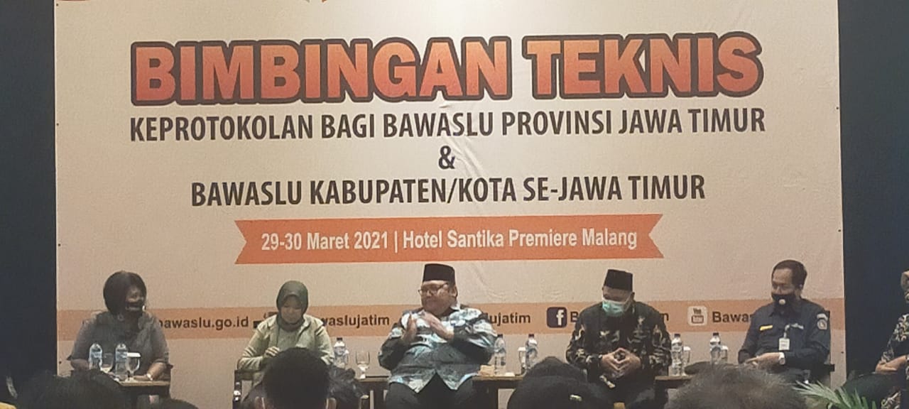 Malang, 30 Maret 2021. https://sampang.bawaslu.go.id/ Hotel Santika Premiere menjadi tempat terselenggaranya Bimbingan Teknis Keprotokolan Bagi Bawaslu Provinsi Jawa Timur Dan Bawaslu Kabupaten/Kota Se-Jawa Timur, dimana acara ini berlangsung dari tanggal 29 -30 Maret 2021 . Kegiatan tersebut di buka oleh Ketua Bawaslu Jawa Timur bapak Moh. Amin yang didampingi oleh Anggota Bawaslu Jatim Totok Haryono, Eka Rahmawati, Nur Elly Anggraeni serta Kepala Sekretariat Bawaslu Jatim Sapni Syaril
