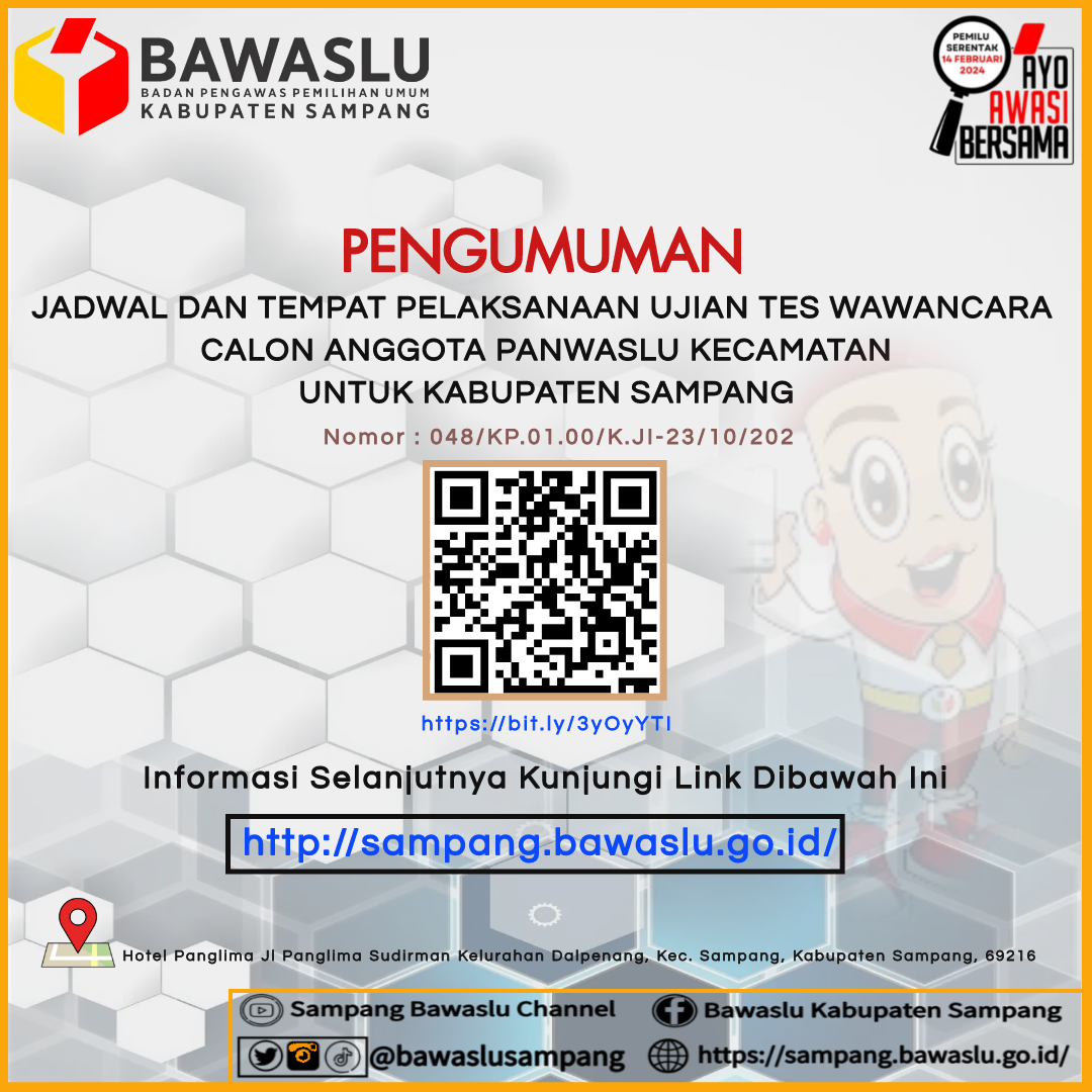 JADWAL DAN TEMPAT PELAKSANAAN UJIAN TES WAWANCARA CALON ANGGOTA PANWASLU KECAMATAN UNTUK KABUPATEN SAMPANG humas | Selasa, Oktober 18, 2022 - 22:29 Jadwal dan Pelaksanaan Tes Wawancara DWONLOAD FILE Tag berita utama Share Berita Terkini humas Kamis, Desember 18, 2025 - 11:24 Tuntaskan Laporan Tahun 2025, Bawaslu Jatim Fasilitasi Finalisasi Lapkir Pencegahan,Pengawasan Partisipatif dan Hubungan Antar Lembaga 38 Kabupaten/Kota humas Rabu, Desember 17, 2025 - 13:31 Bawaslu Sampang Gelar Diskusi "Ngopi": Mengenal Peran Fungsi dan Kinerja Humas Bawaslu Kabupaten Sampang humas Selasa, Desember 16, 2025 - 15:34 Bawaslu Sampang ikuti Sosialisasi Pemutakhiran Data Parpol Berkelanjutan Melalui SIPOL di KPU Sampang Lihat Lainnya