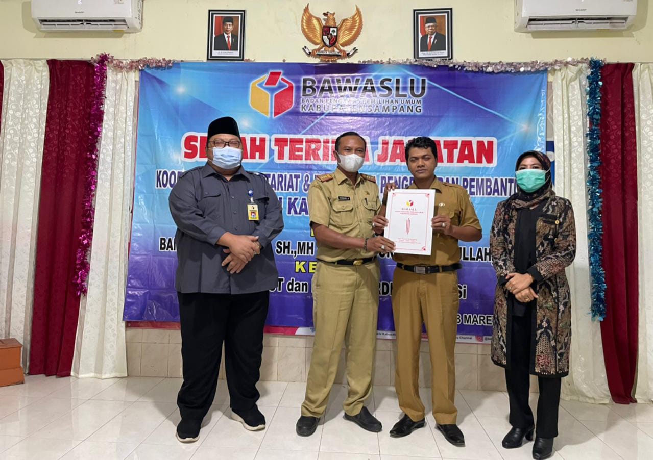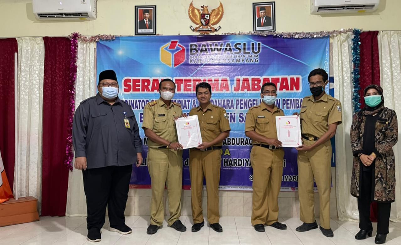 Serah terima jabatan Koordinator Sekretariat Bawaslu Kabupaten Sampang dan Bendahara Pembantu Pengeluaran, dari Koordinator Sekretariat periode 2017-2020 yang dijabat oleh Bapak Bambang Maryono.SH.,M.H, kepada Bapak Ali Nurdi.ST.