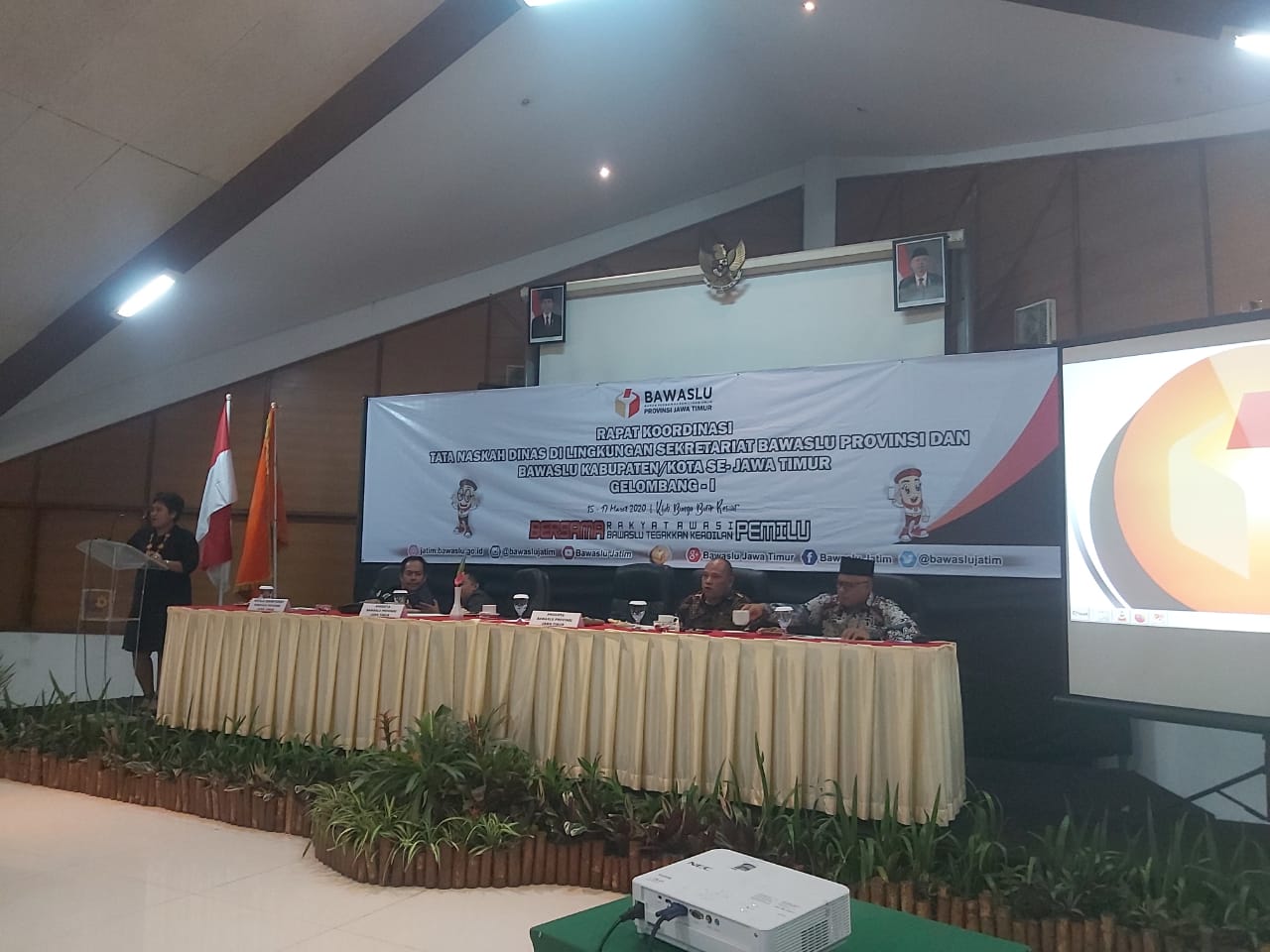 Bawaslu Provinsi Jawa Timur gelar Rapat Koordinasi di Klub Bunga Resort Hotel Kota Batu pada hari minggu tanggal (15 s/17, 03, 2020 ) dengan Tema Tata Naskah Dinas di Lingkungan Sekretariatan Bawaslu Provinsi dan Bawaslu Kabupaten/Kota se-Jawa Timur, Malang 15-03-2020.