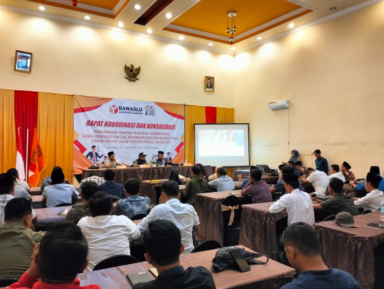 Sampang.Badan Pengawas Pemilihan Umum (Bawaslu) Kabupaten Sampang Melakukan Rapat Koordinasi dan Konsolidasi bersama Panwascam Se-Kabupaten Sampang bertempat di Aula Hotel Panglima, dimana acara tersebut berlangsung dua hari dari tanggal 18-19 November 2022.